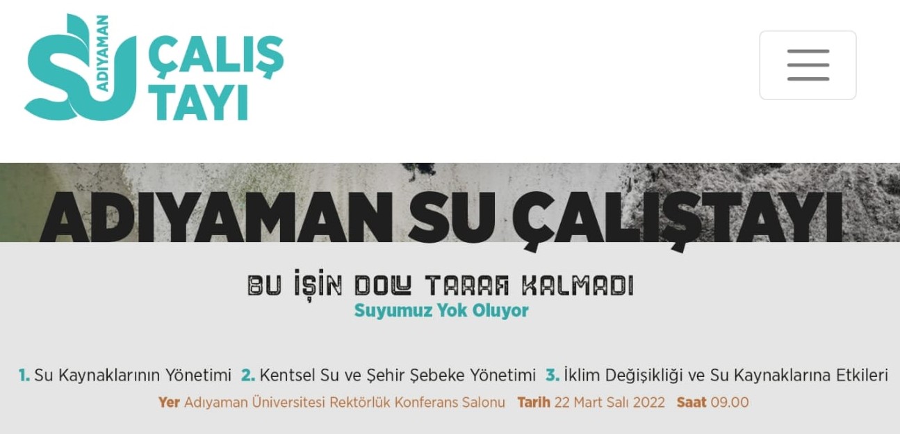 Adıyaman Valiliği, Adıyaman Üniversitesi, Adıyaman İl Tarım ve Orman Müdürlüğü, Adıyaman İl Sağlık Müdürlüğü, Meteoroloji Müdürlüğü ile DSİ Adıyaman Şube Müdürlüğü'nün de destekleriyle 22 Mart Salı günü saat 09.00 da Adıyaman Üniversitesi Rektörlük Konferans Salonunda gerçekleşecek olan etkinliğin açılışını 60. Hükümet Çevre ve Orman Bakanı. 61, 62, 63, 64 ve 65. Hükümet Orman ve Su İşleri Bakanı, Dünya Su Konseyi Eski Guvernörü, T.C Cumhurbaşkanı Irak Özel Temsilcisi Prof. Dr. Veysel Eroğlu ile Gaziantep Hasan Kalyoncu Üniversitesi Öğretim Üyesi Prof Dr. Mehmet Karpuzcu yapacak.