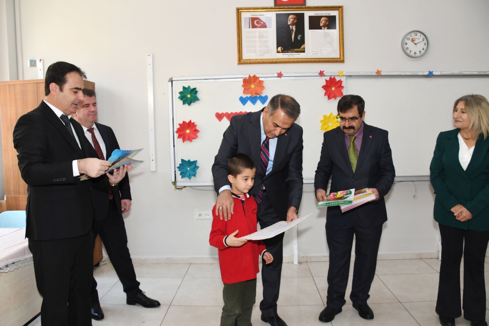 Karne dağıtım törenine katılmak üzere Şehit Mehmet Kılınç İlkokuluna gelen Vali Mahmut Çuhadar, öğrenciler tarafından çiçeklerle karşılandı.