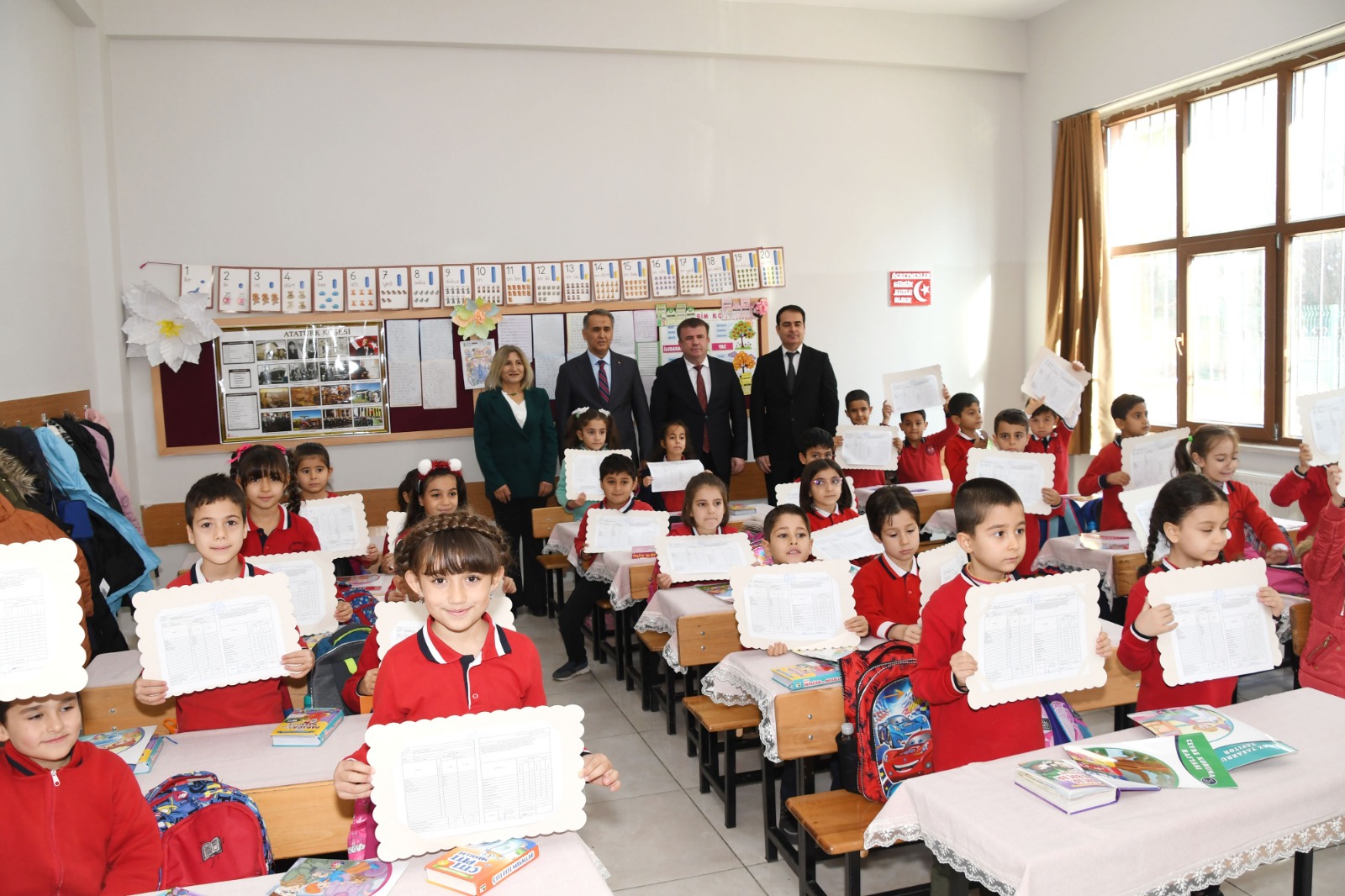 Vali Mahmut Çuhadar, daha sonra sınıfları gezerek öğrencilere karnelerini dağıttı.