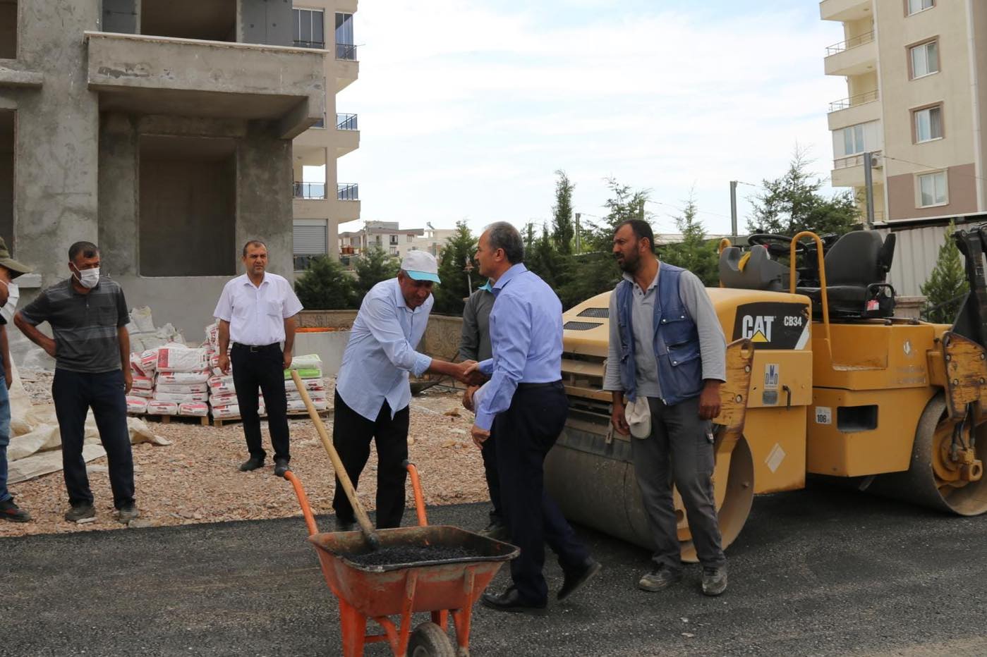 asfaltlama çalışmalarını yerinde inceleyerek, çalışan personellere kolaylıklar diledi.
