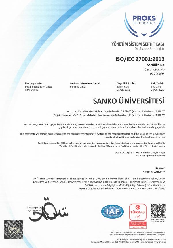 - SANKO ÜNİVERSİTESİ'NİN ISO BİLGİ GÜVENLİĞİ YÖNETİM SİSTEMİ BELGESİ GURURU