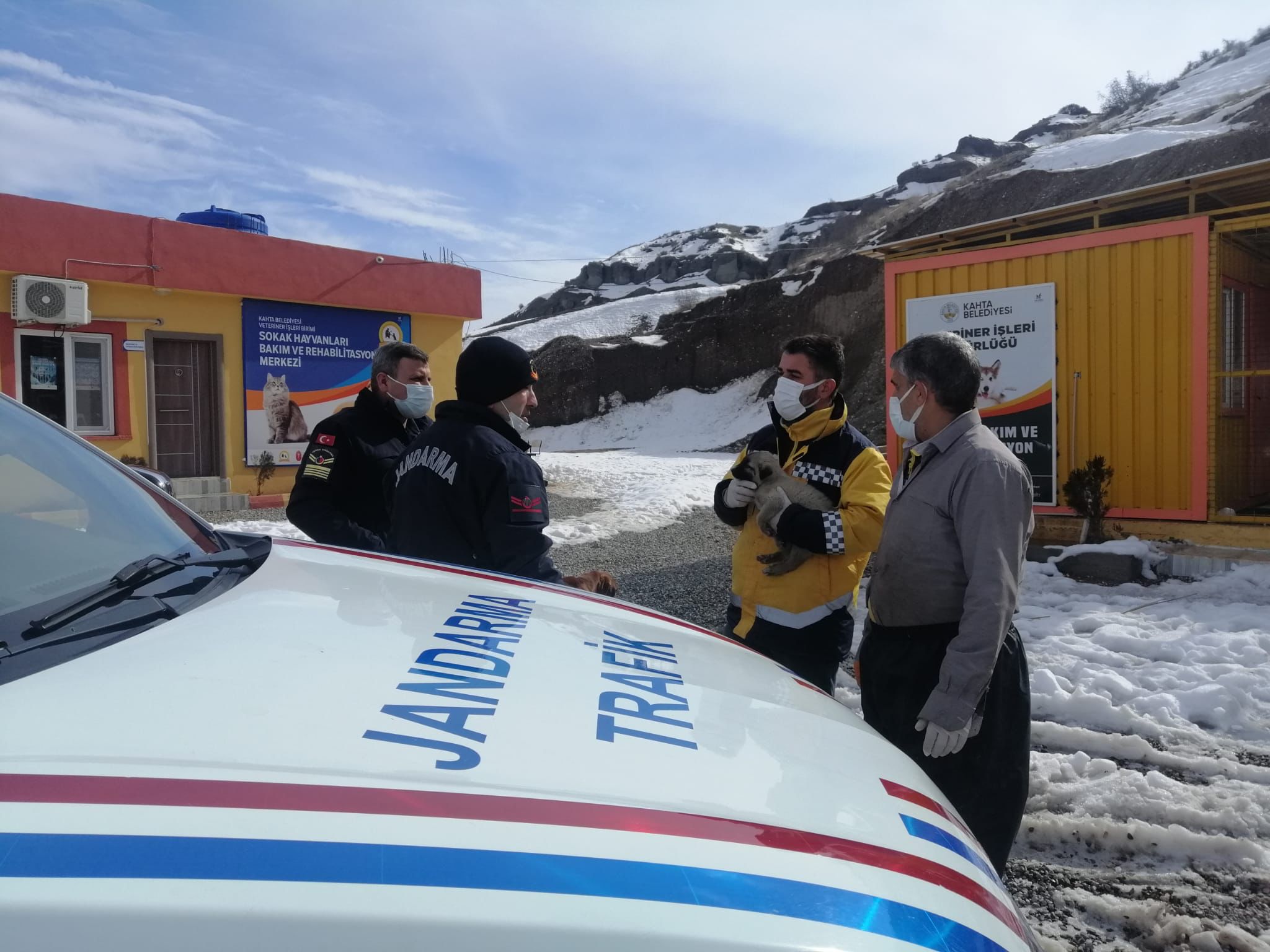 Adıyaman İl Jandarma Komutanlığı Kahta İlçe Jandarma Komutanlığı emrinde görevli Trafik unsurlarınca Kahta- Diyarbakır Karayolunda devriye faaliyeti esnasında yol kenarında soğuktan, bitkin ve yorgun düşmüş vaziyette köpek yavrusu fark edilmiş, köpek yavrusunun gerekli bakım ihtiyaçlarının giderilmesi maksadıyla Kahta Sokak Hayvanları Bakım ve Rehabilitasyon Merkezine teslim edilmiştir.