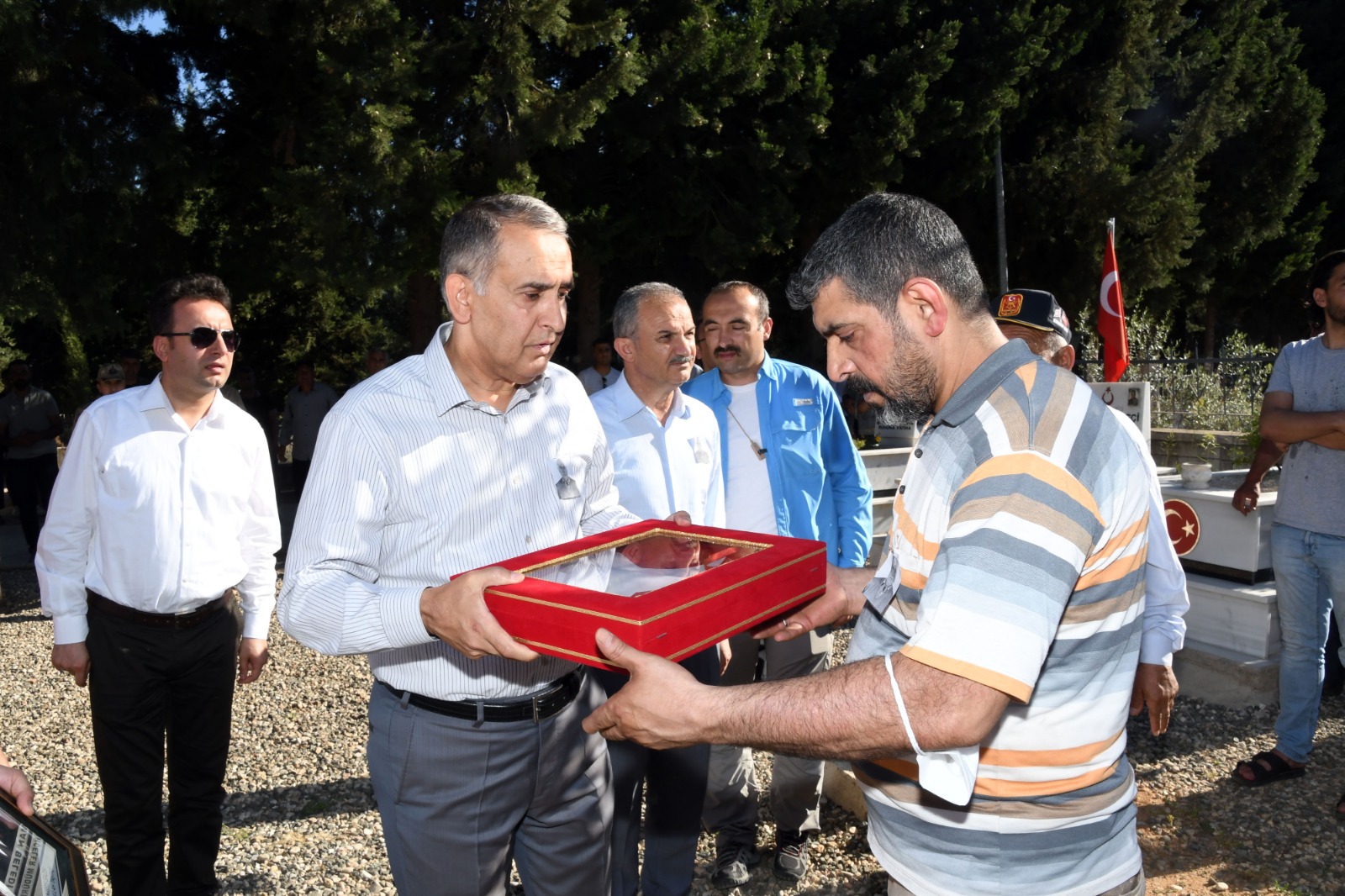 Vali Mahmut Çuhadar, Kıbrıs Gazisi Abdullah Taştaş'ın tabutunun üzerindeki Türk Bayrağını oğlu Orhan Taştaş'a takdim etti.