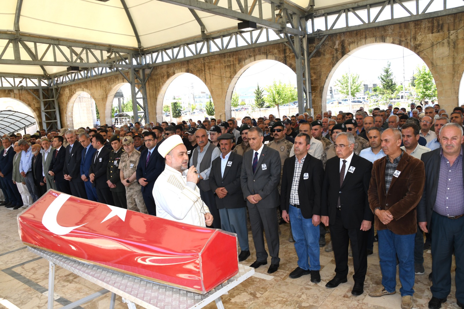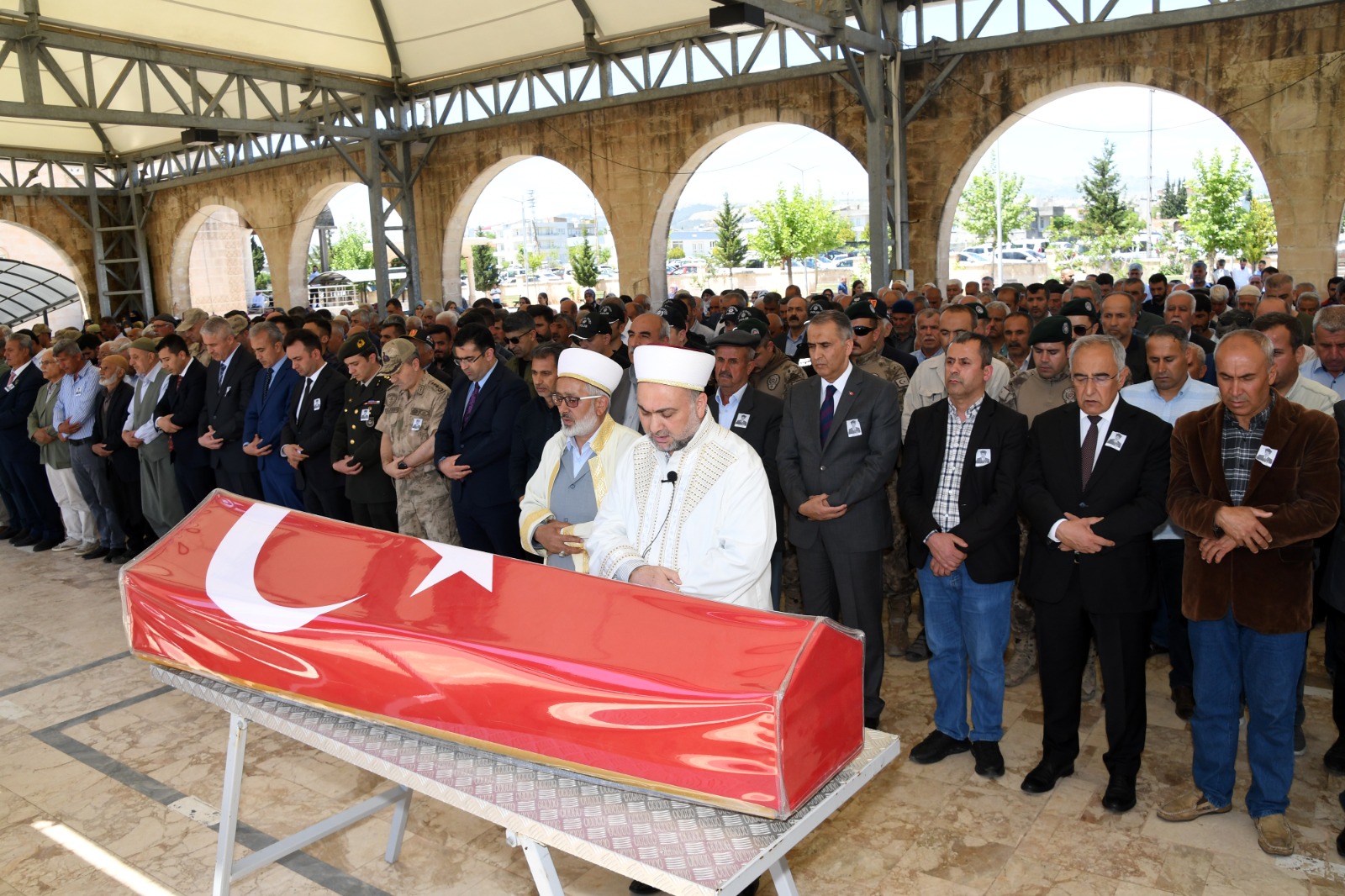 Vali Mahmut Çuhadar, Kıbrıs Gazisi Aziz Çelik'in tabutunun üzerindeki Türk Bayrağını öperek oğlu Yusuf Çelik'e takdim etti.
