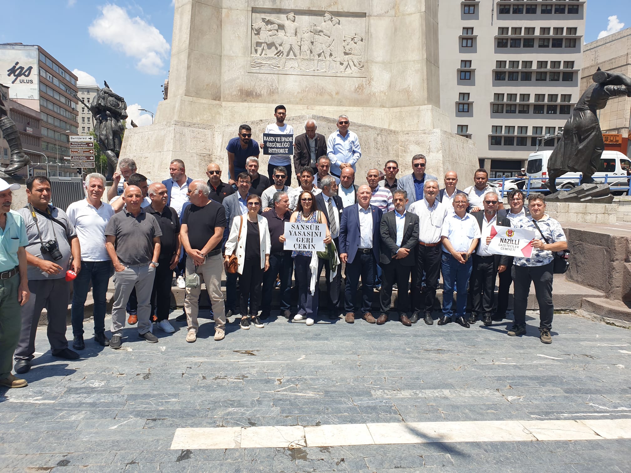 Geniş güvenlik önlemleri altında gerçekleştirilen protesto eyleminin sonunda gazeteciler "sansüre dur" demek için kalemini Atatürk Anıtı önüne bıraktı.