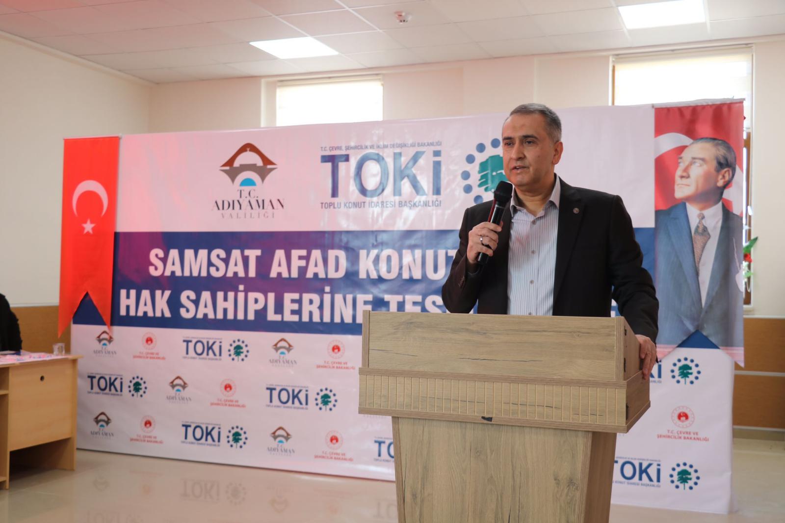 Samsat Afet konutları teslim törenine Vali Mahmut ÇUHADAR, Samsat Kaymakamı Aziz Oğuz ALEMDAROĞLU, İl Afet ve Acil Durum (AFAD) Müdürü Osman Ertuğrul ALTUĞ, TOKİ yetkilileri ve hak sahibi vatandaşlar katıldı.
