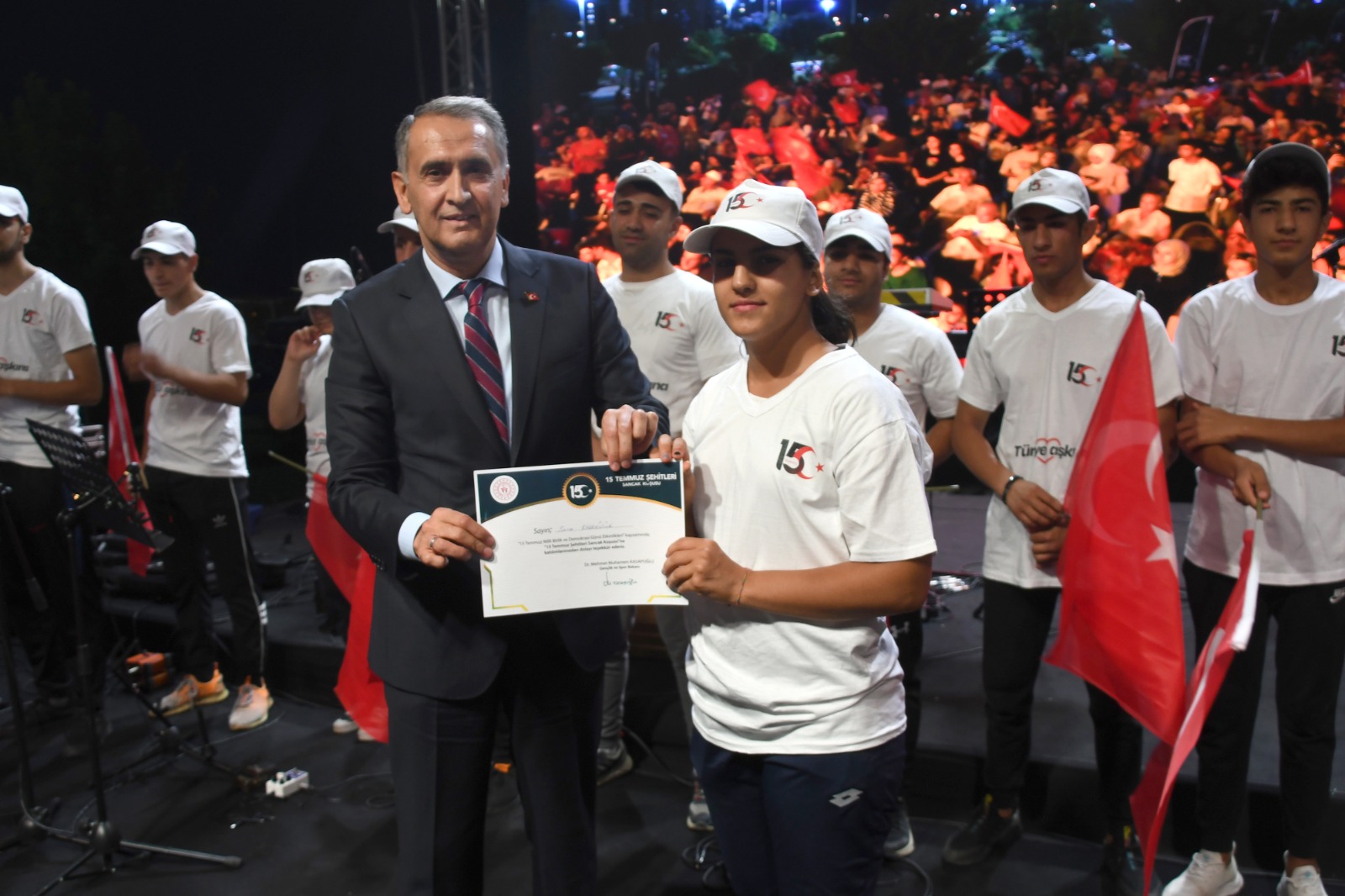 Konuşmaların ardından 15 Temmuz Demokrasi ve Milli Birlik Günü Anma Etkinlikleri kapsamında "15 Temmuz Şehitleri Sancak Koşusu" nu gerçekleştiren Gençlik Spor İl Müdürlüğüne bağlı sporcular AY YILDIZLI SANCAĞI Vali Mahmut Çuhadar'a takdim etti.