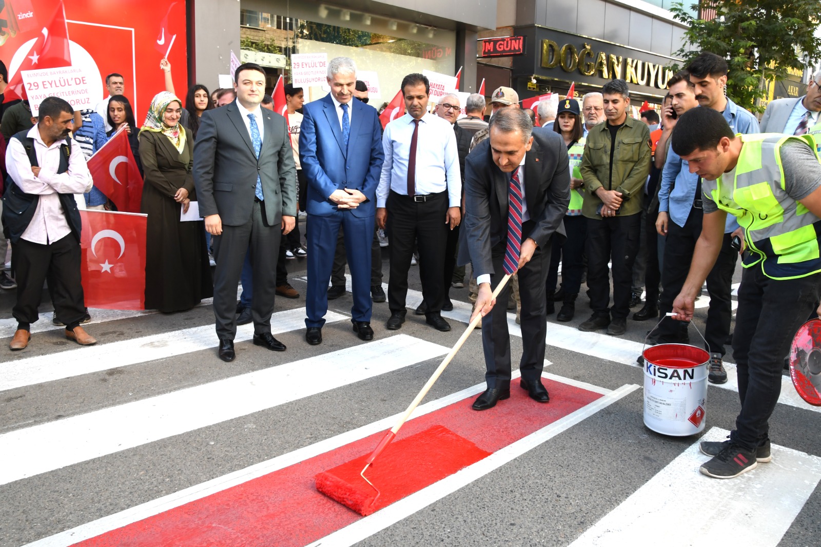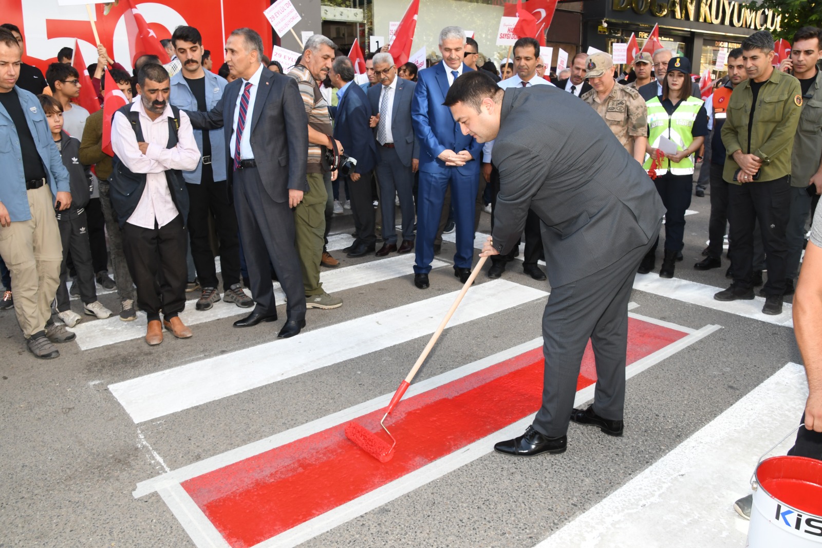 Trafikte yaya önceliğine dikkati çekmek amacıyla başlatılan kampanya kapsamında Vali Mahmut Çuhadar, il protokolü ve öğrencilerle birlikte Eskisaray Mahallesi Gölbaşı Caddesi 1 Aralık İlkokulu önündeki ışıksız yaya geçidini kırmızıya boyadı.