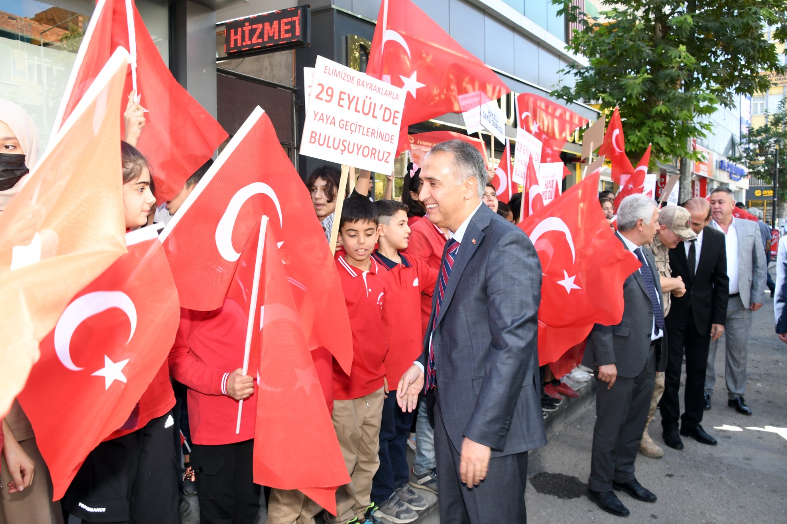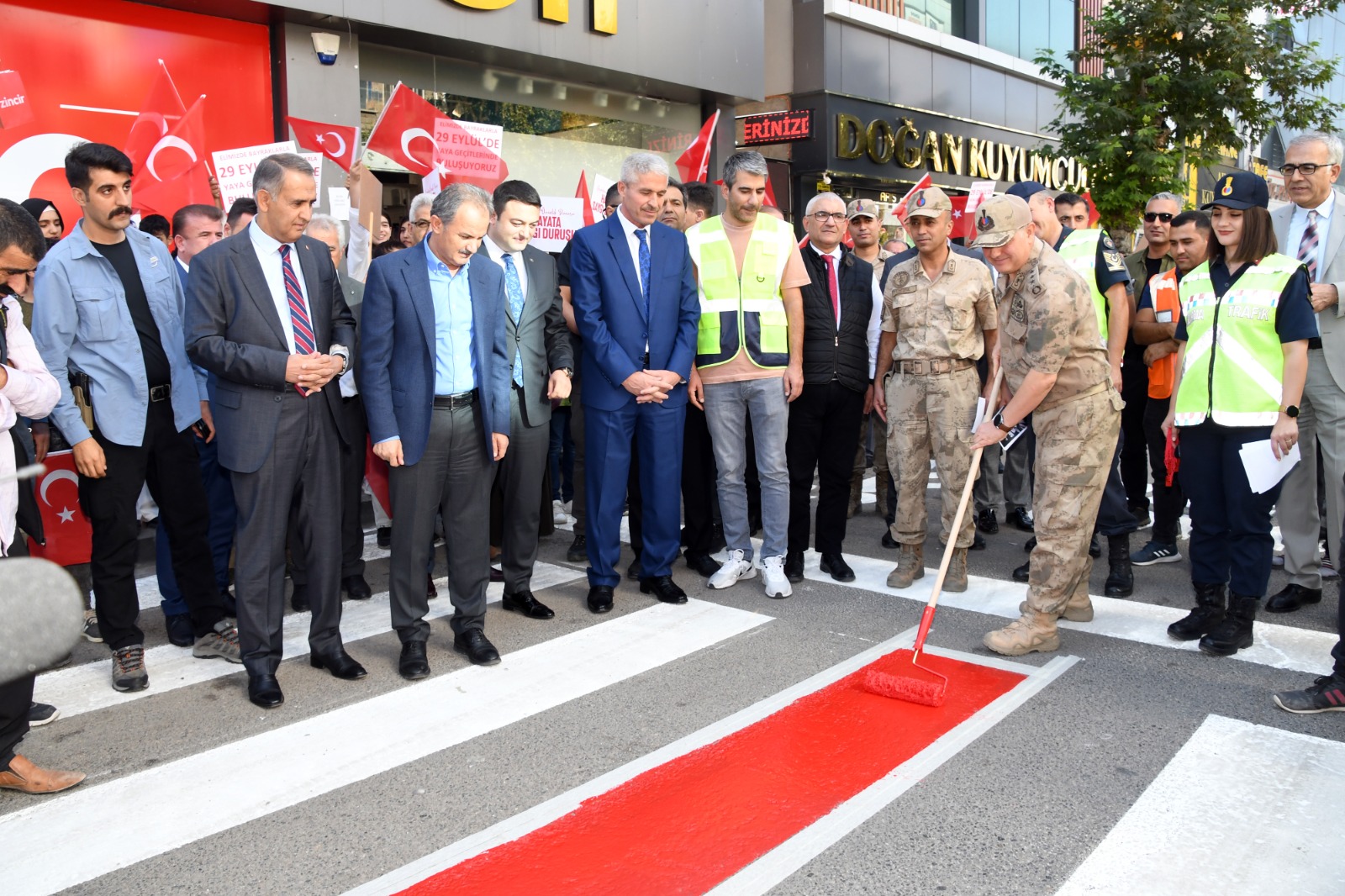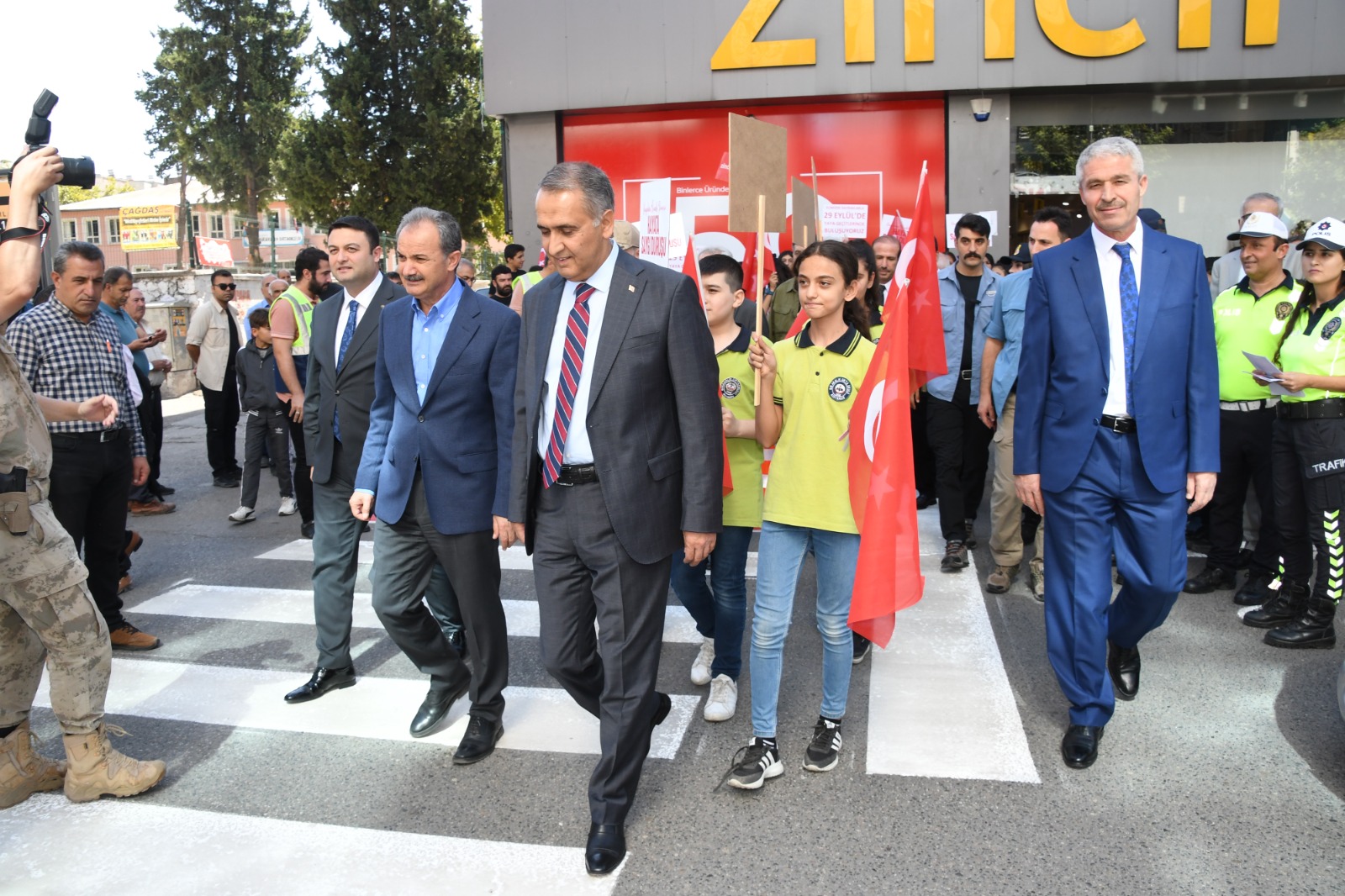 Vali Mahmut Çuhadar ve protokol üyeleri, yaya önceliği konusunda farkındalık oluşturmak amacıyla öğrencilerle birlikte yaya geçidinden geçti.