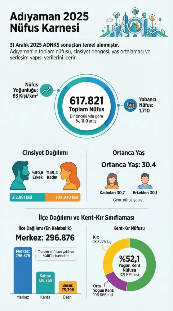 31 Aralık 2025 itibarıyla Adrese Dayalı Nüfus Kayıt Sistemi (ADNKS) verileri de bu dönüşü net şekilde ortaya koyuyor. Adıyaman’ın nüfusu bir önceki yıla göre yüzde 11 artarak 617 bin 821’e ulaştı.