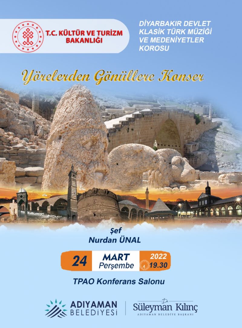 Adıyaman Belediyesi’nin katkılarıyla, Diyarbakır Devlet Klasik Türk Müziği ve Medeniyetler Korosu tarafından Adıyamanlılar için 'Yörelerden Gönüllere Konseri' düzenlenecek.