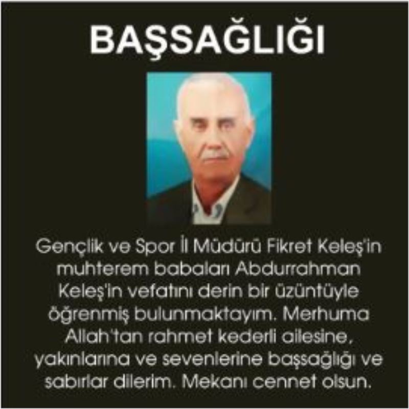 Gençlik ve Spor İl müdürü Fikret Keleş’in muhterem babası Abdurrahman Keleş’in vefatını derin bir üzüntüyle öğrendik. Merhuma allahtan rahmet kendilerine, ailesine yakınlarına ve sevenlerine başsağlığı ve sabırlar dileriz.mekanı cennet olsun.